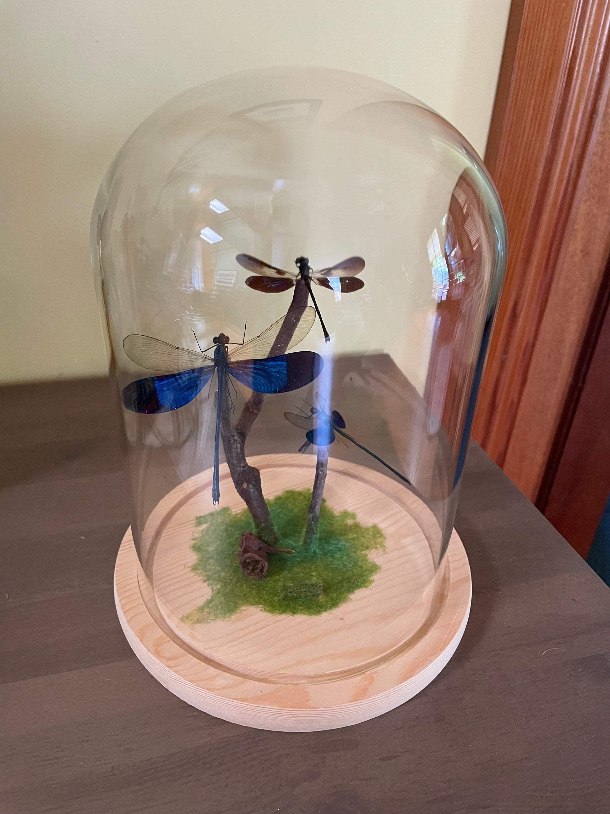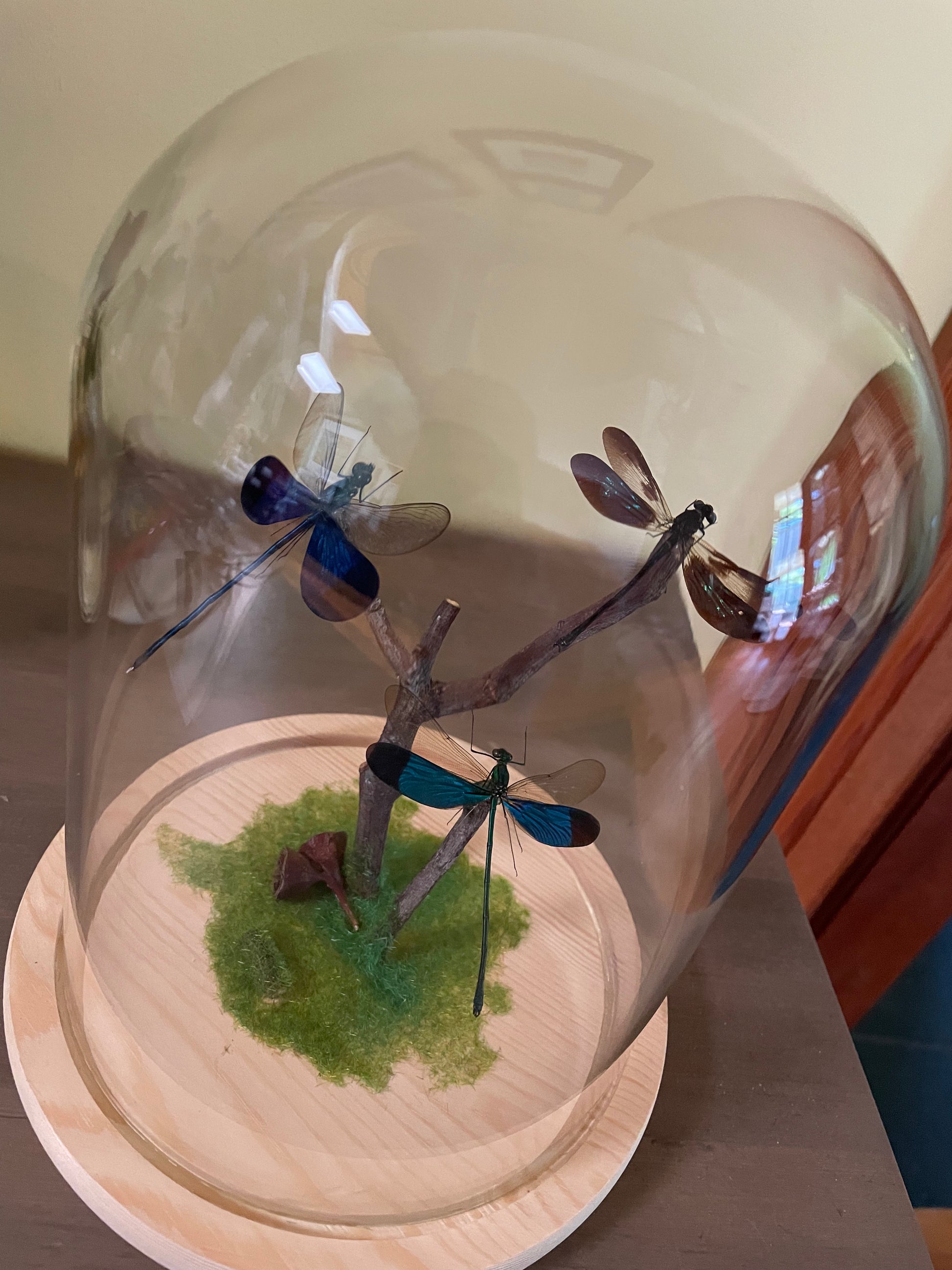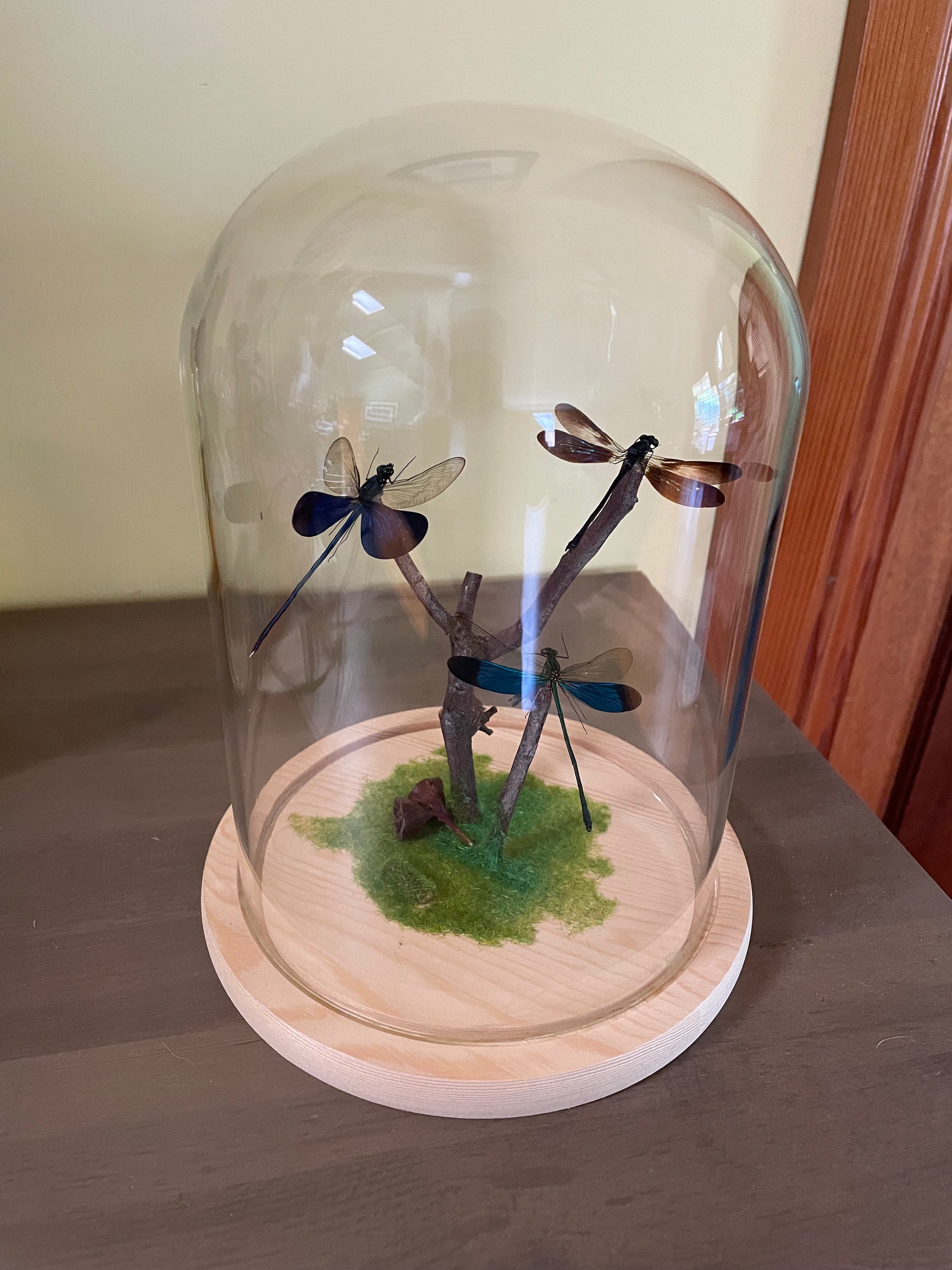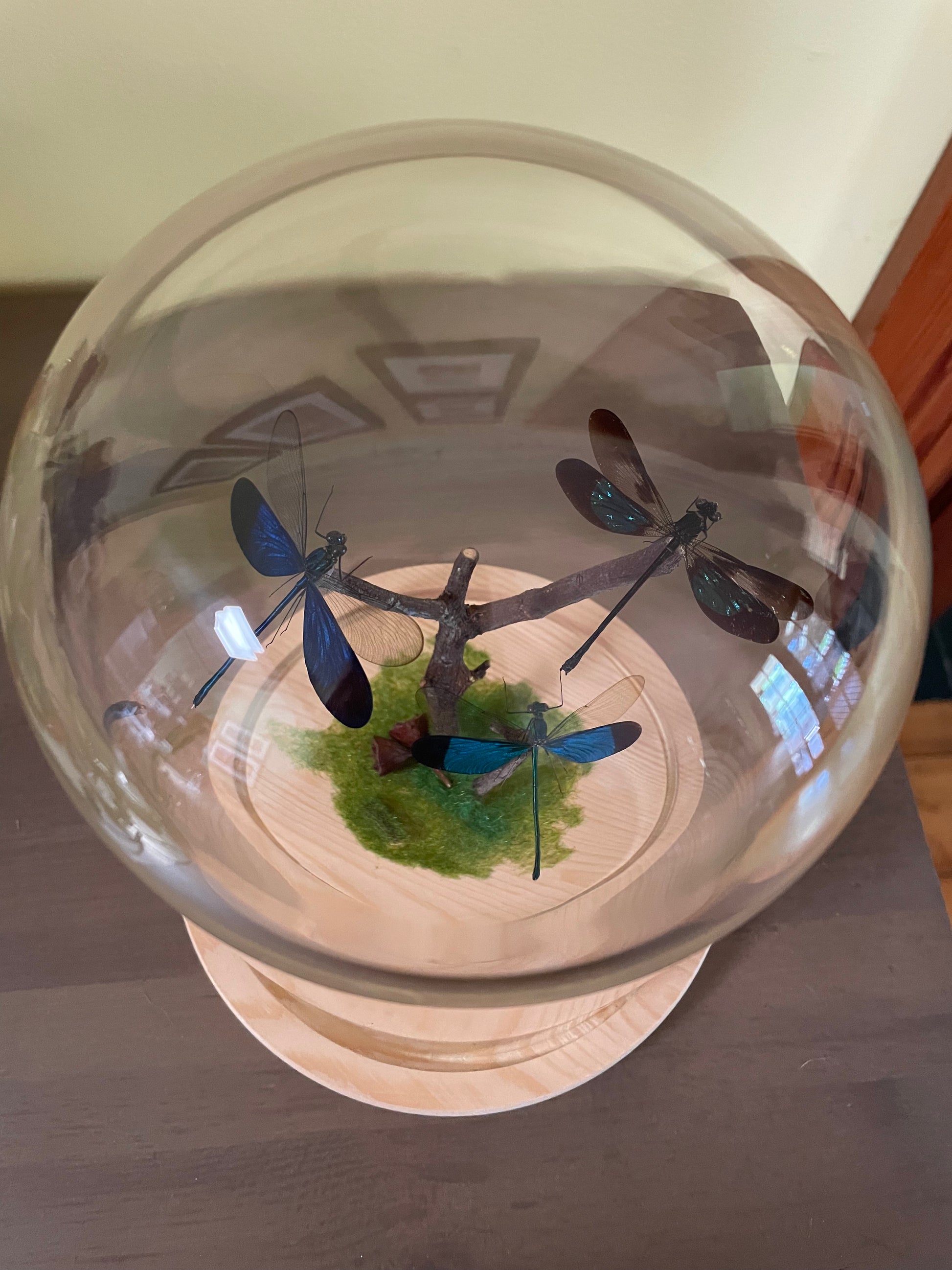Assorted Damselflies in glass dome. 3 real beautiful damselflies with iridescent wings placed in a glass display dome together.