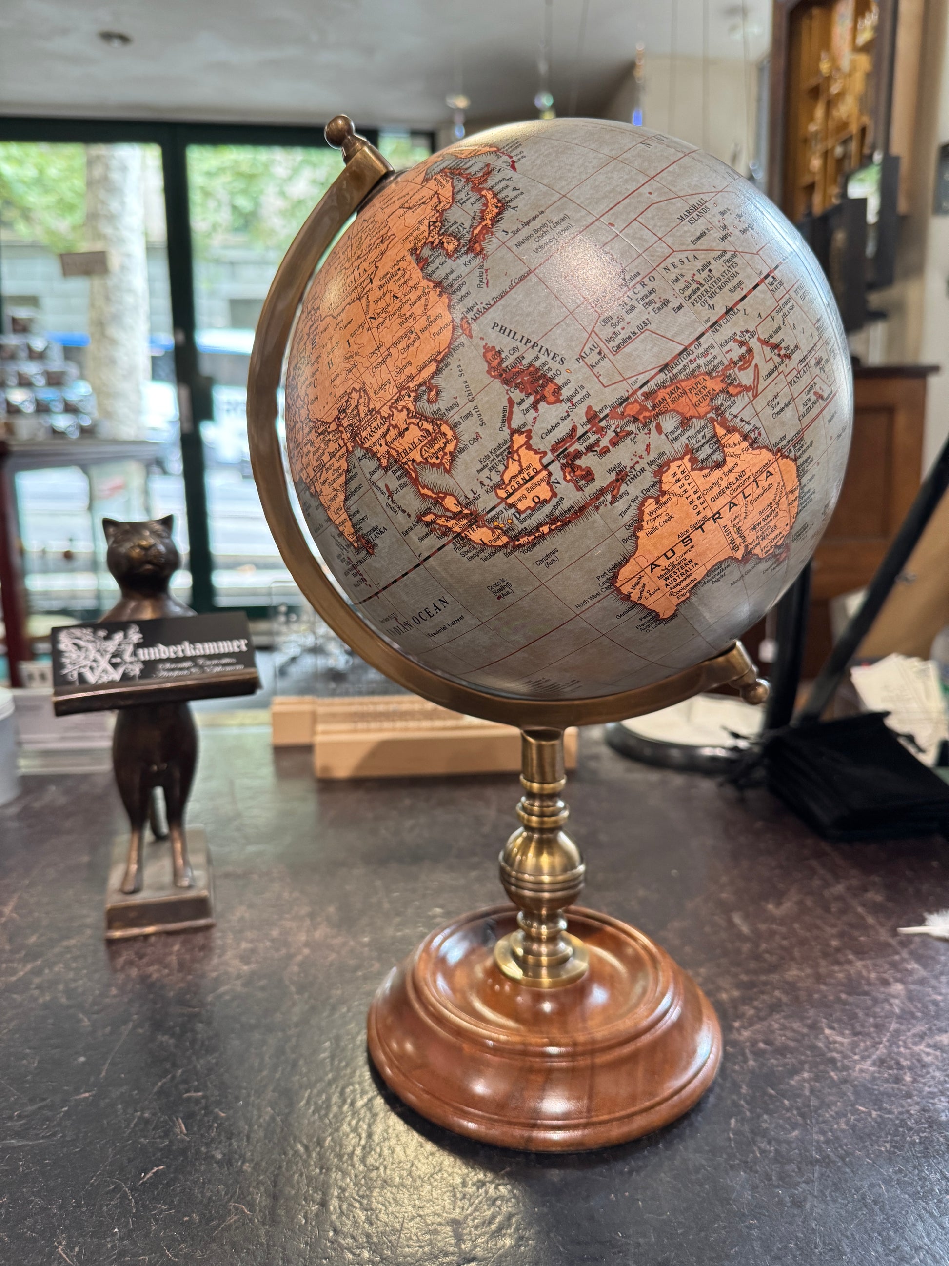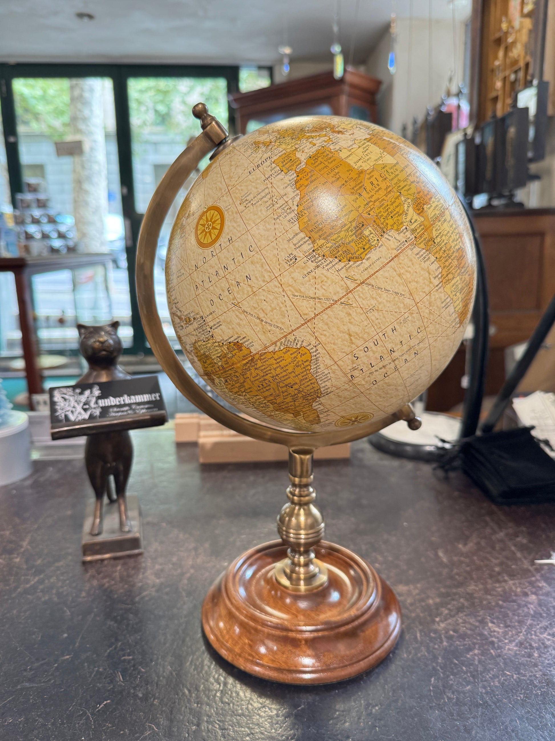 Map your adventure! 8” globe sits on a hand turned wood base. Finished with brass accents. The perfect mid of old and new.