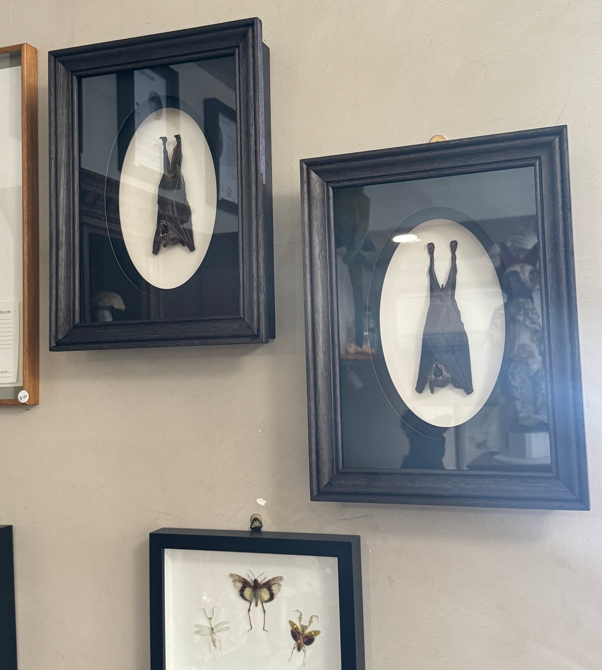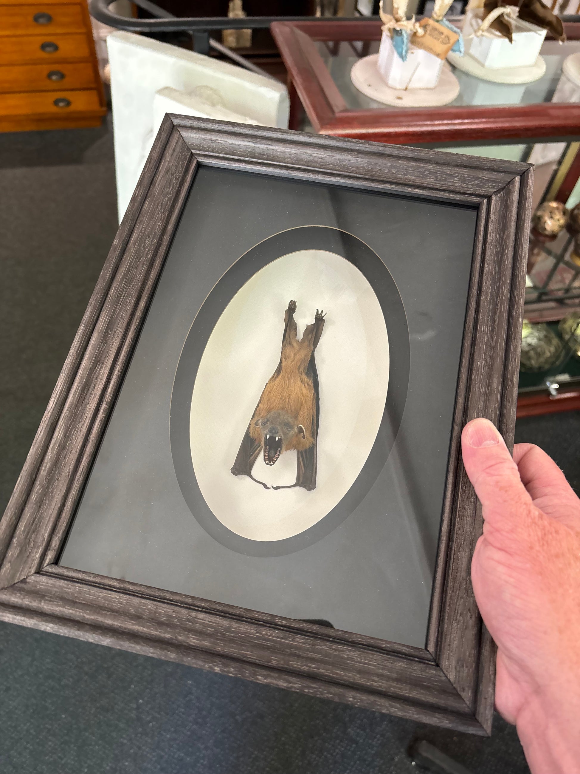 This is our new design with a hanging bat in a double oval ornament in a shadow box frame.