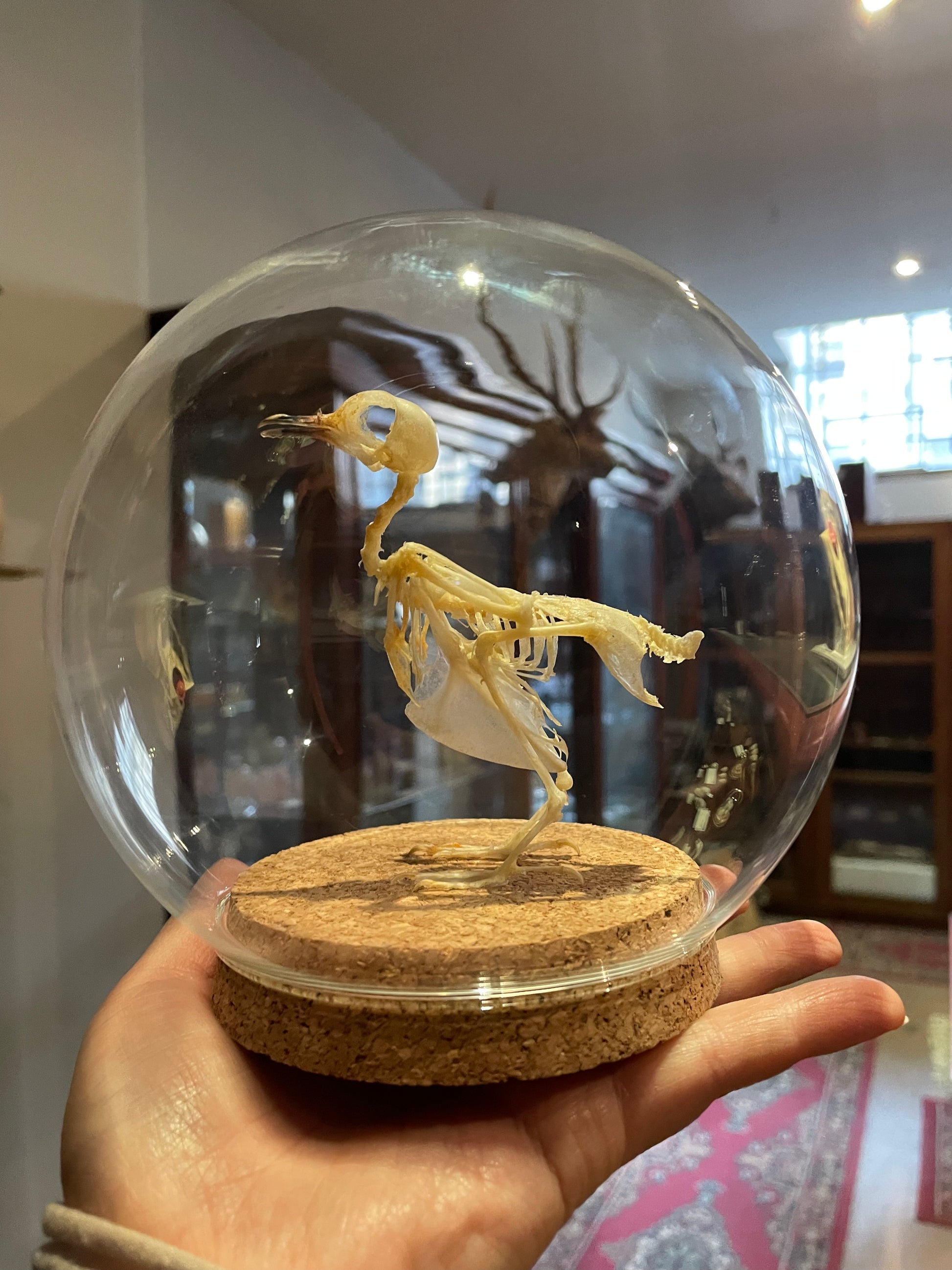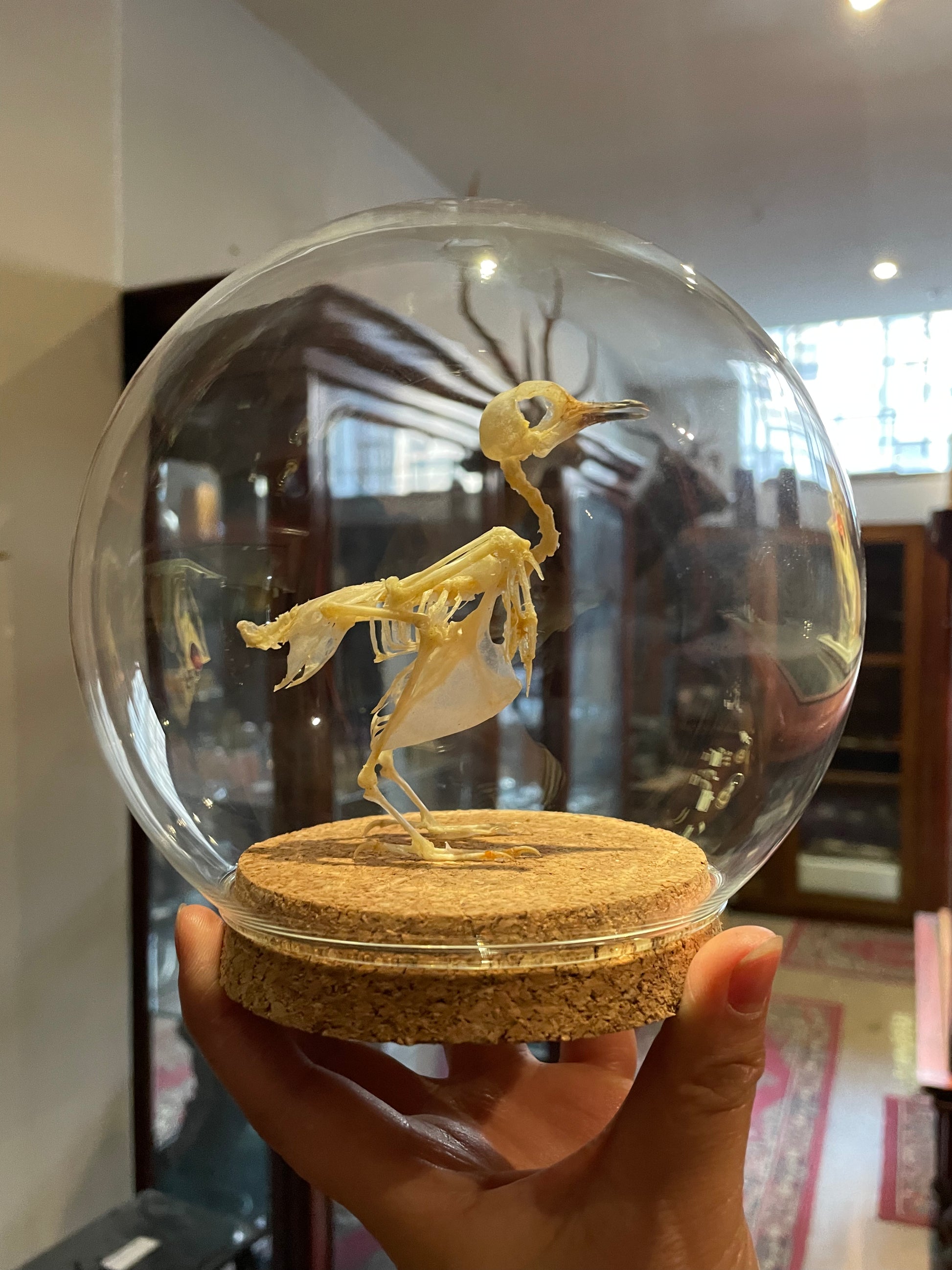 Zebra dove skeleton in glass dome.