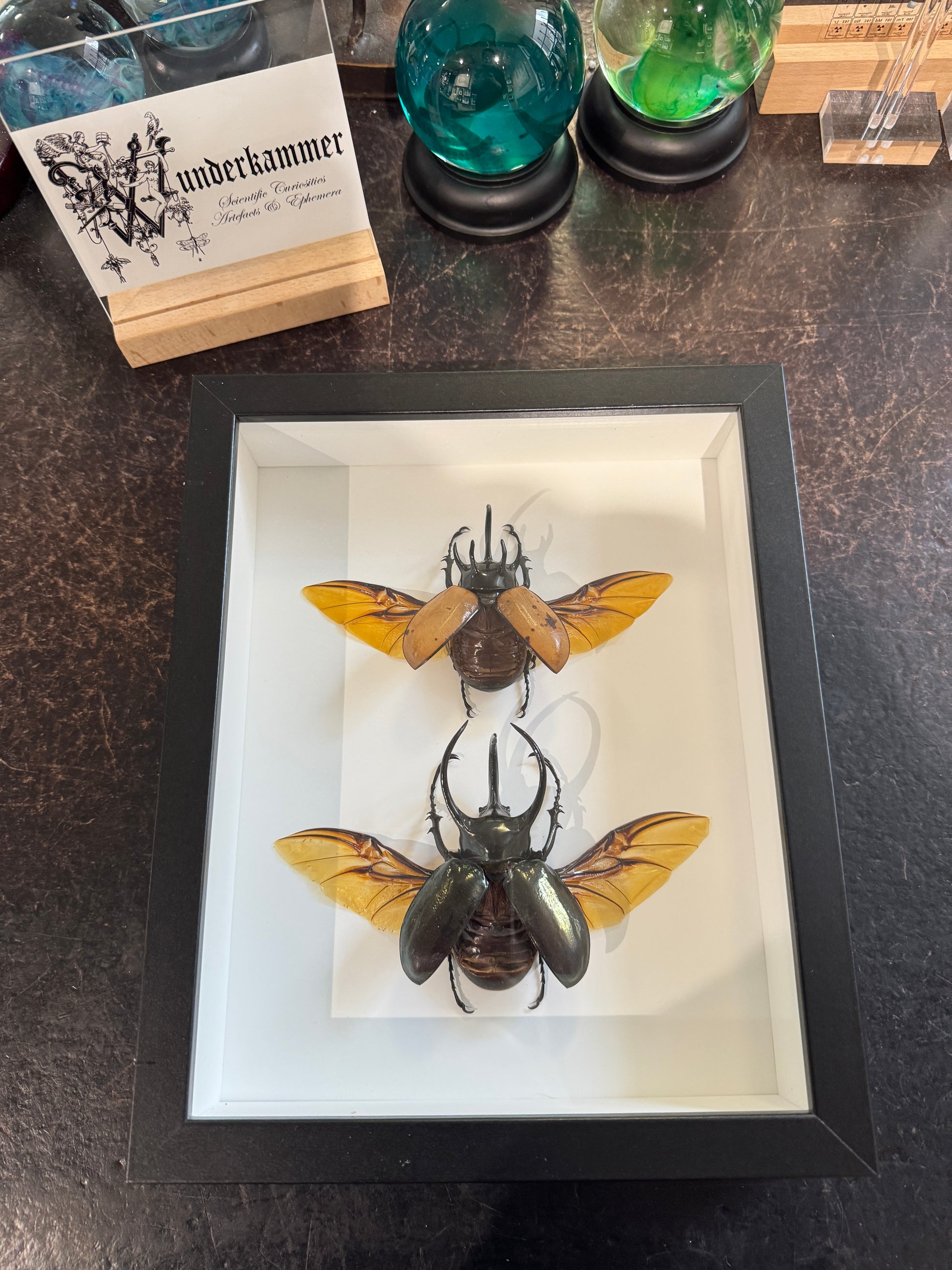 Five-horned golden rhino beetle and a giant atlas beetle with open wings.
