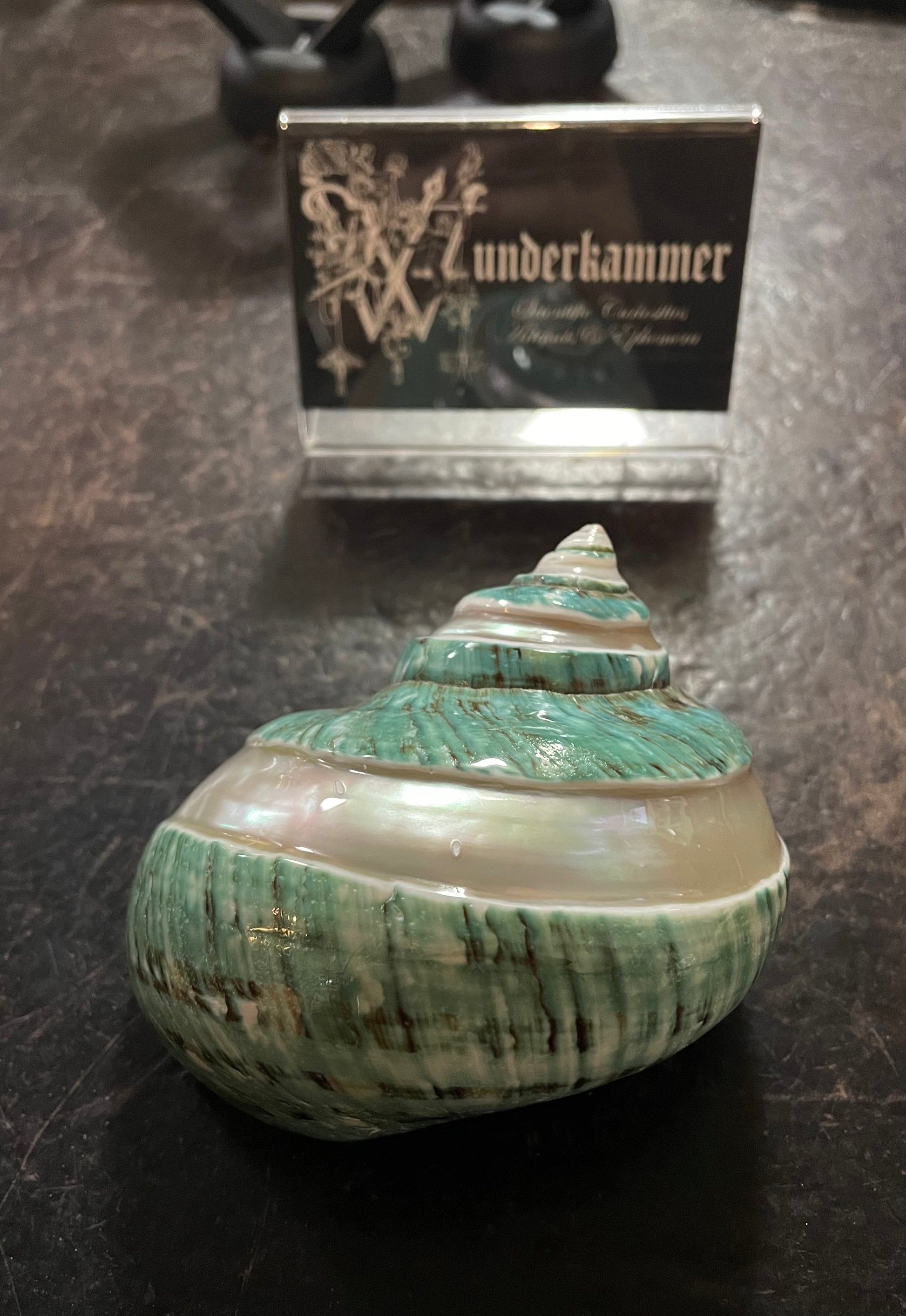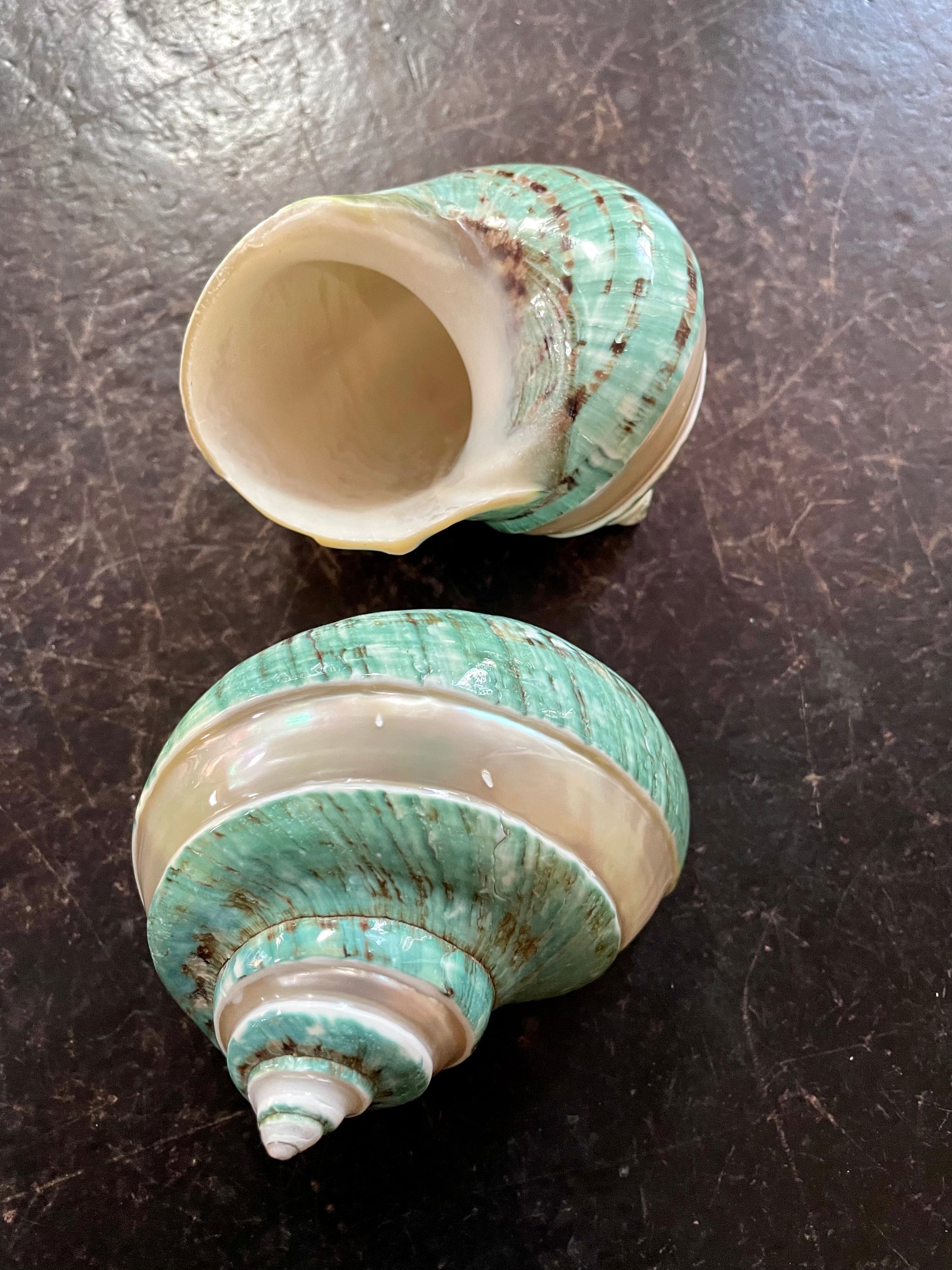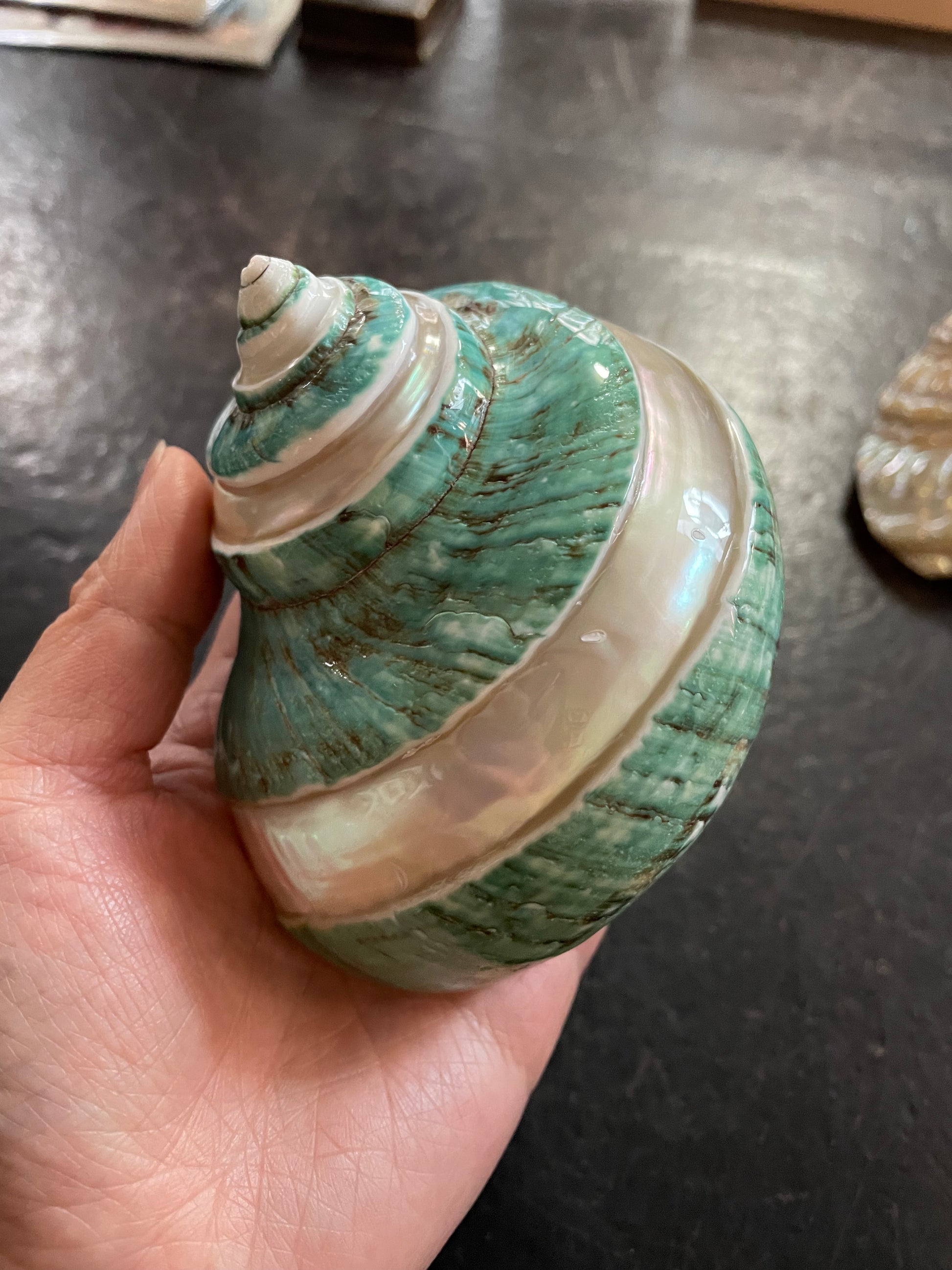 Beautiful natural polished banded green jade turbo hermit crab seashell. About 8-10cm.